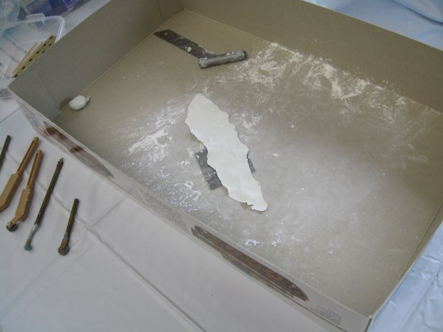 位置決めと伸ばしたパテの形状は、水を塗る前にあらかじめ乗せてみる