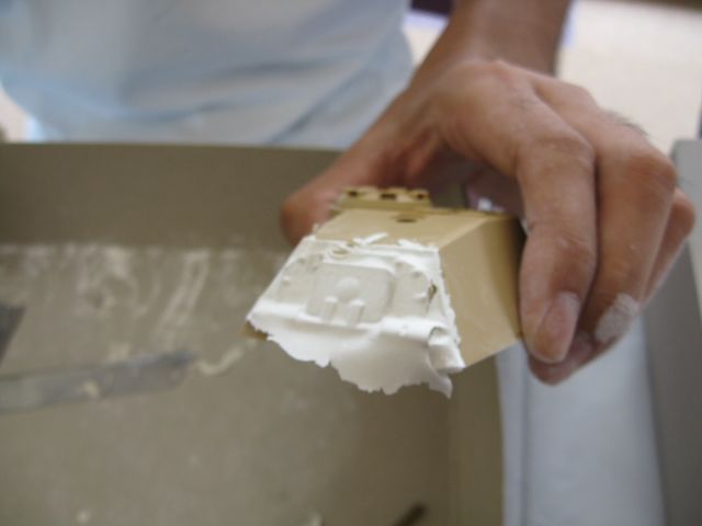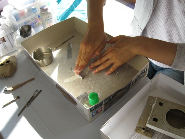 まずは面からはみ出し、余ったパテを指やカッターで削ぎ落とします。